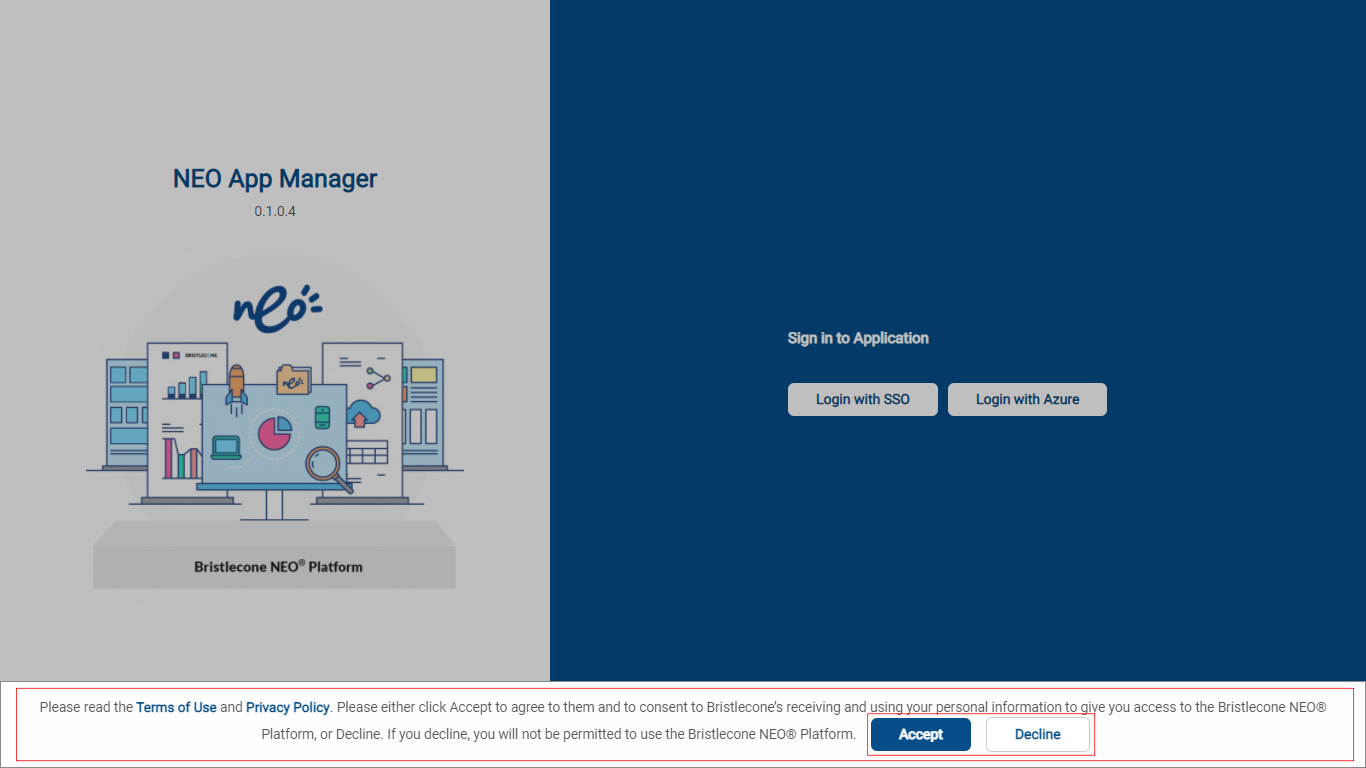 For the first time login to any of the NEO Platform Application, all the user must accept the Consent of the Privacy Policy to continue signing in. Declining the Consent will not let the user log in to the application. Acceptance of the Privacy Policy is a one-time activity from a user. Once a user Accept the Privacy Policy, the NEO Platform remembers the user and won’t ask for any consent to login to any of the platform application thereafter.