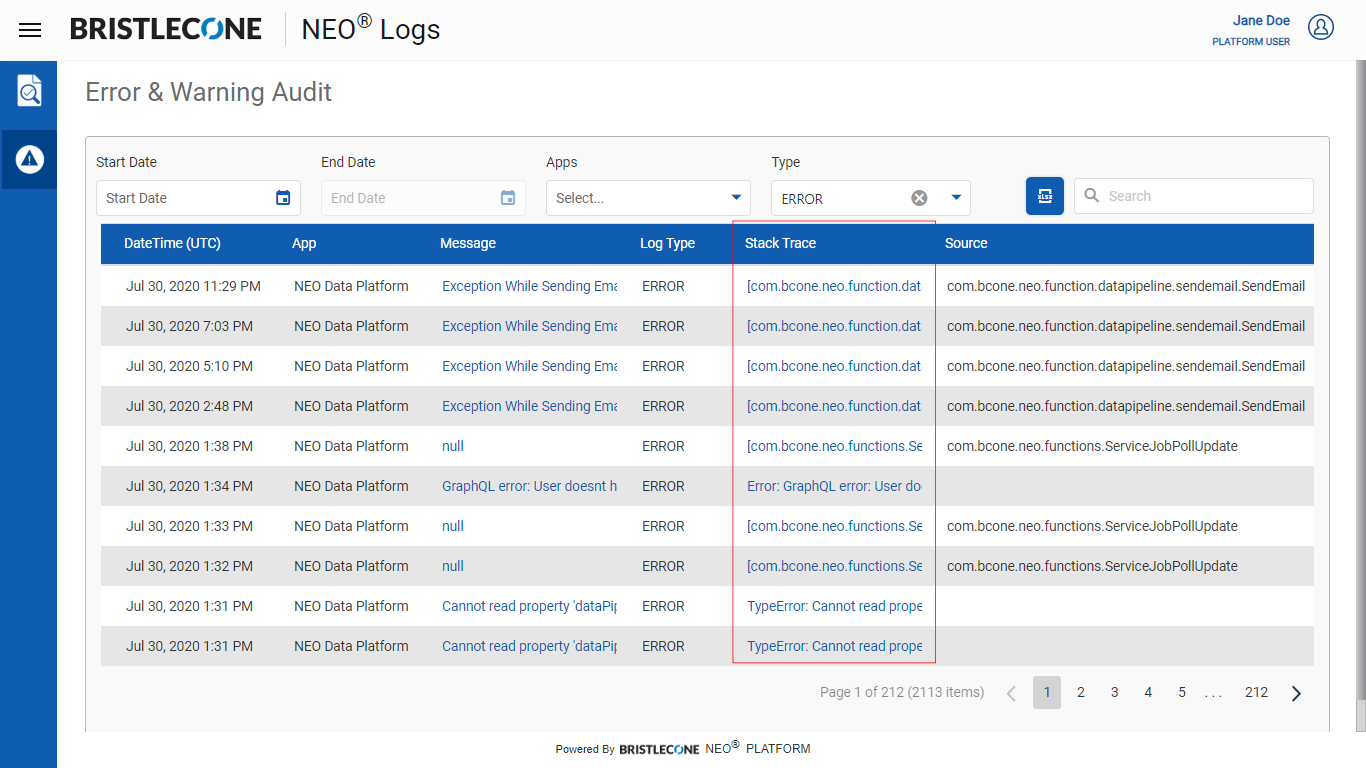 The Platform user can audit all the reports of errors and warnings encountered in any of the application. Error & Warning Audit page logs all such reports to be viewed by the Platform User only