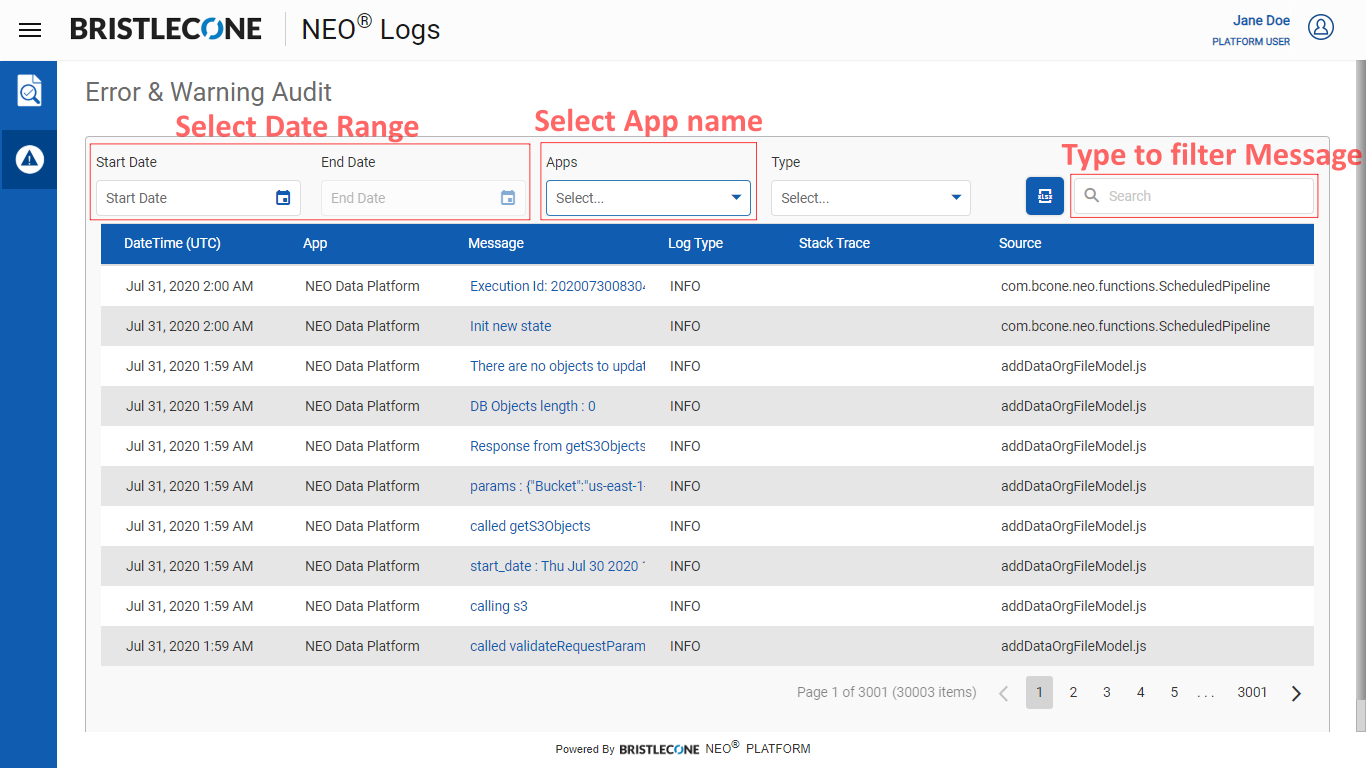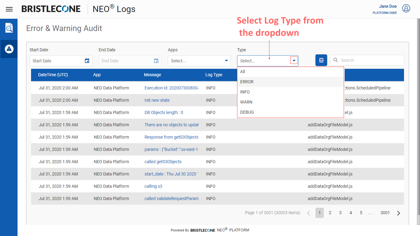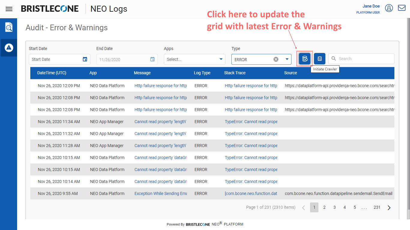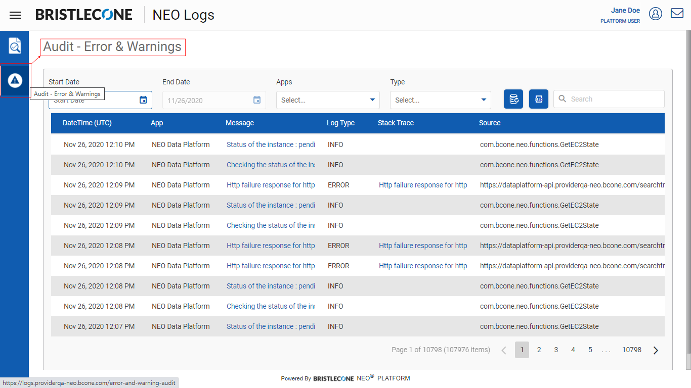 Platform User can access this page by clicking on Error & Warning Audit icon from the left panel as shown below
