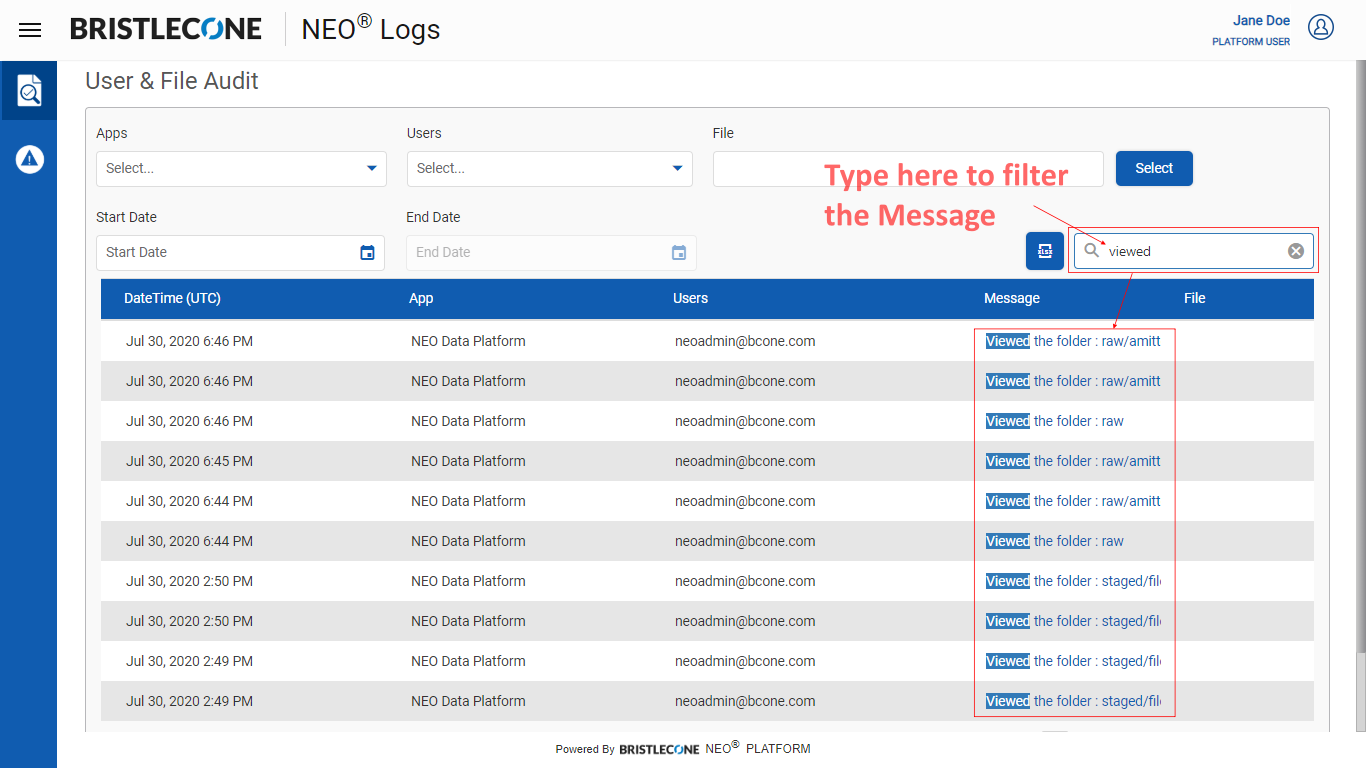 The Platform Users can filter the log report as per Message content. Type the message in the search box as shown below. The matched content will display in the grid
