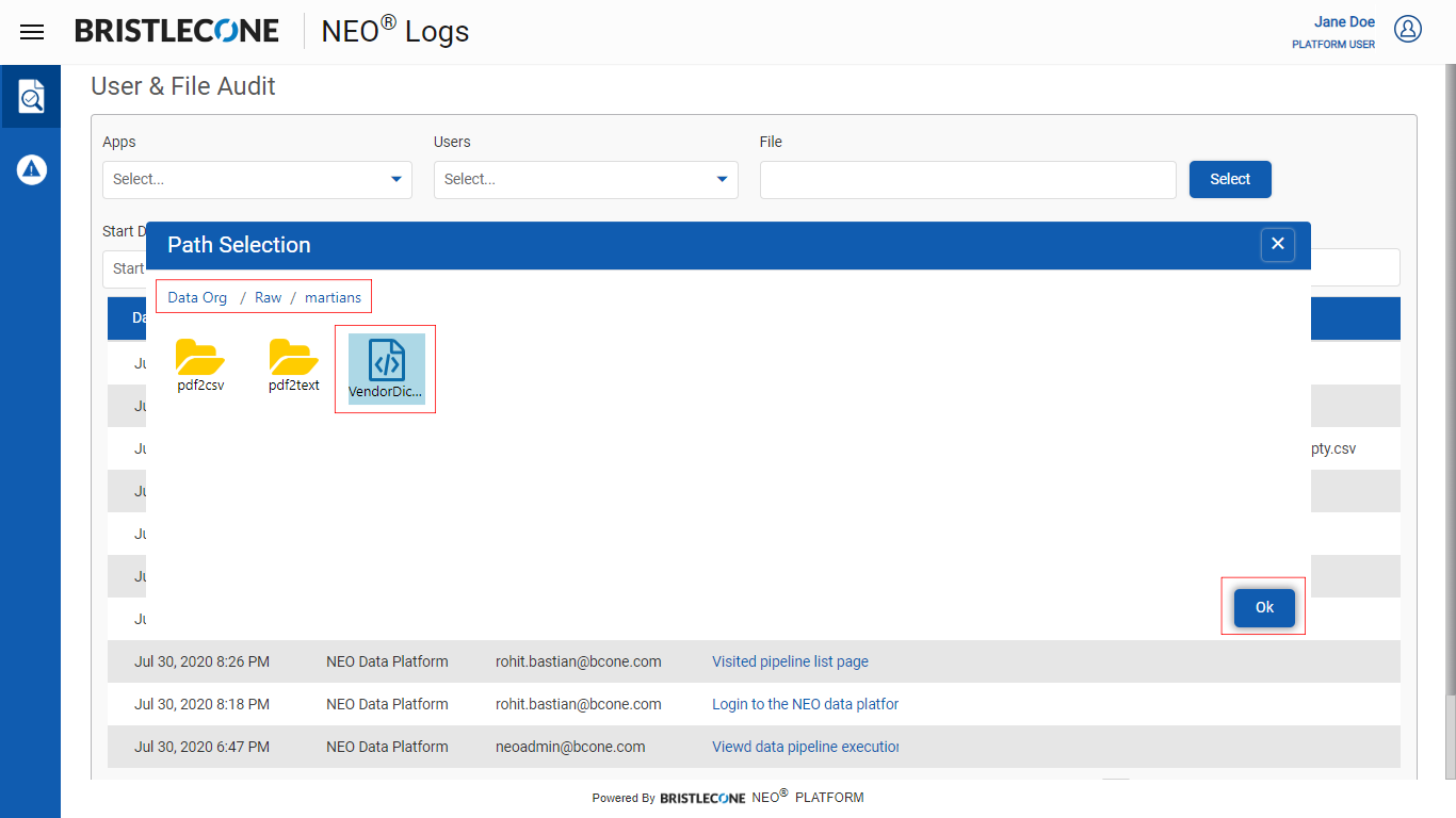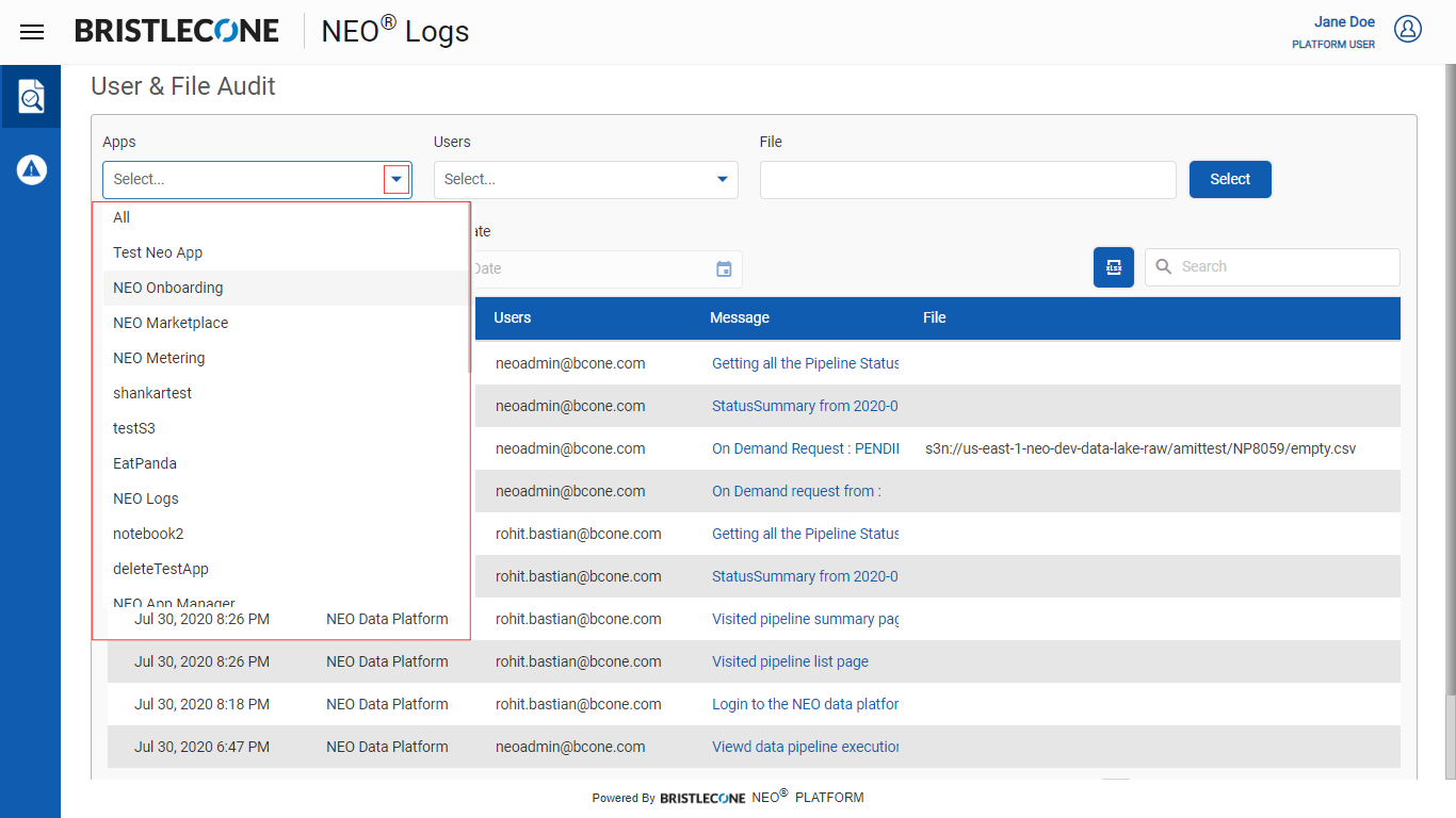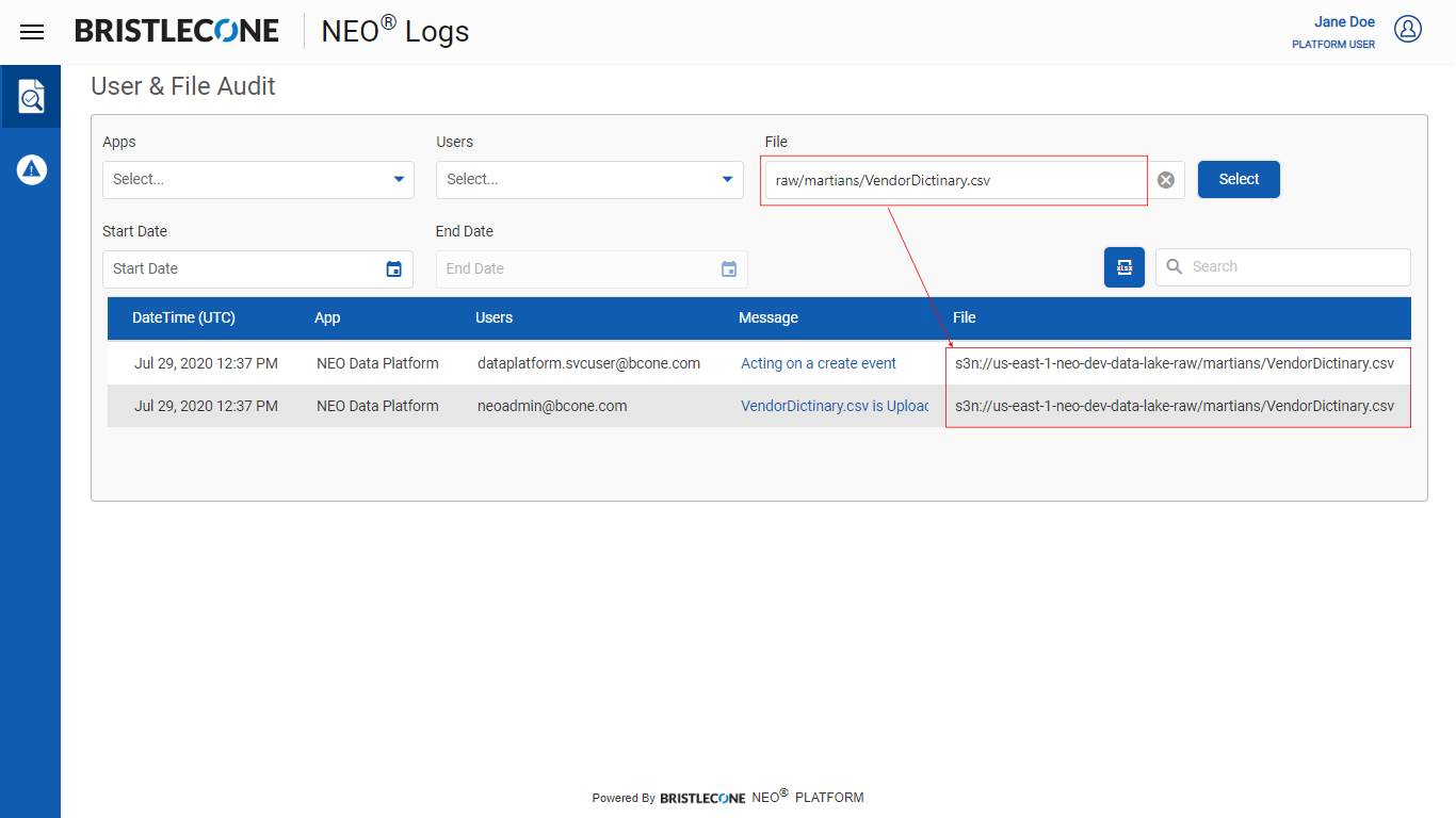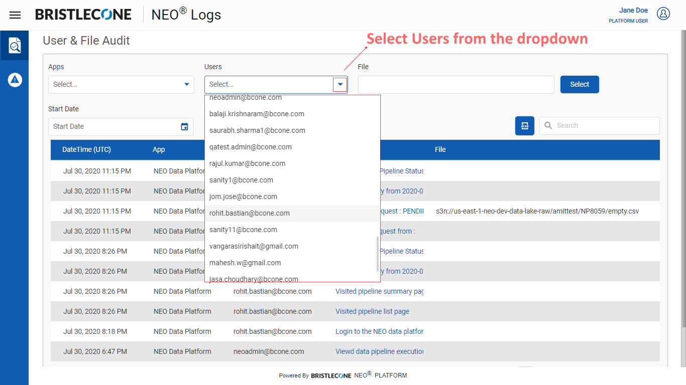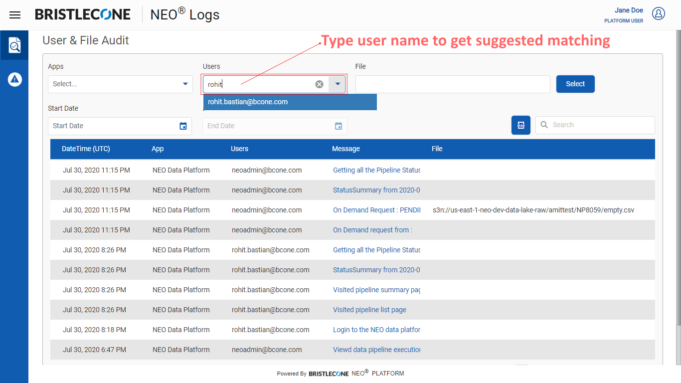 The default landing page is User & File Audit, where the Platform User can perform the following actions