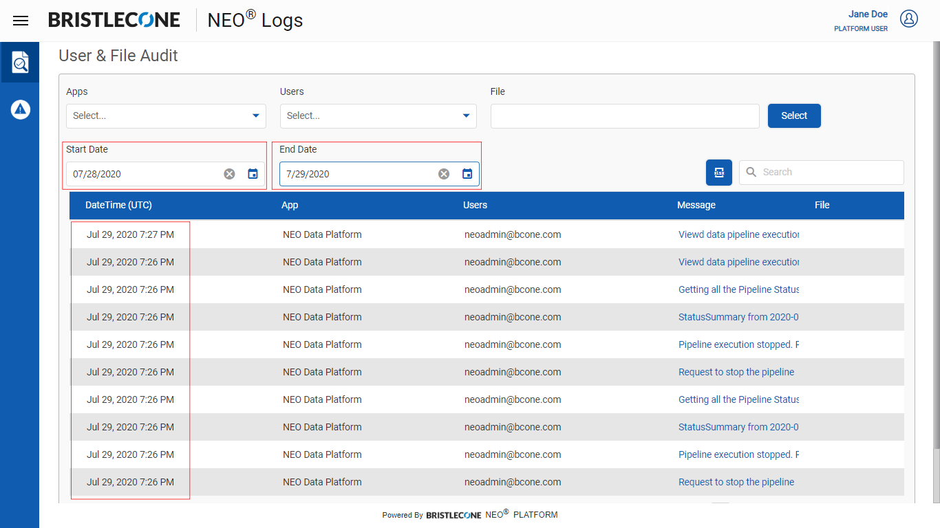 The Platform Users can filter the log report for a specific date range by selecting the Start Date and End Date from the Calendar