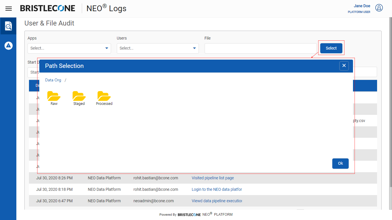 The Platform User can view all the audit reports of Users and Files and their details in a grid view. Using the pagination, the user can browse other pages