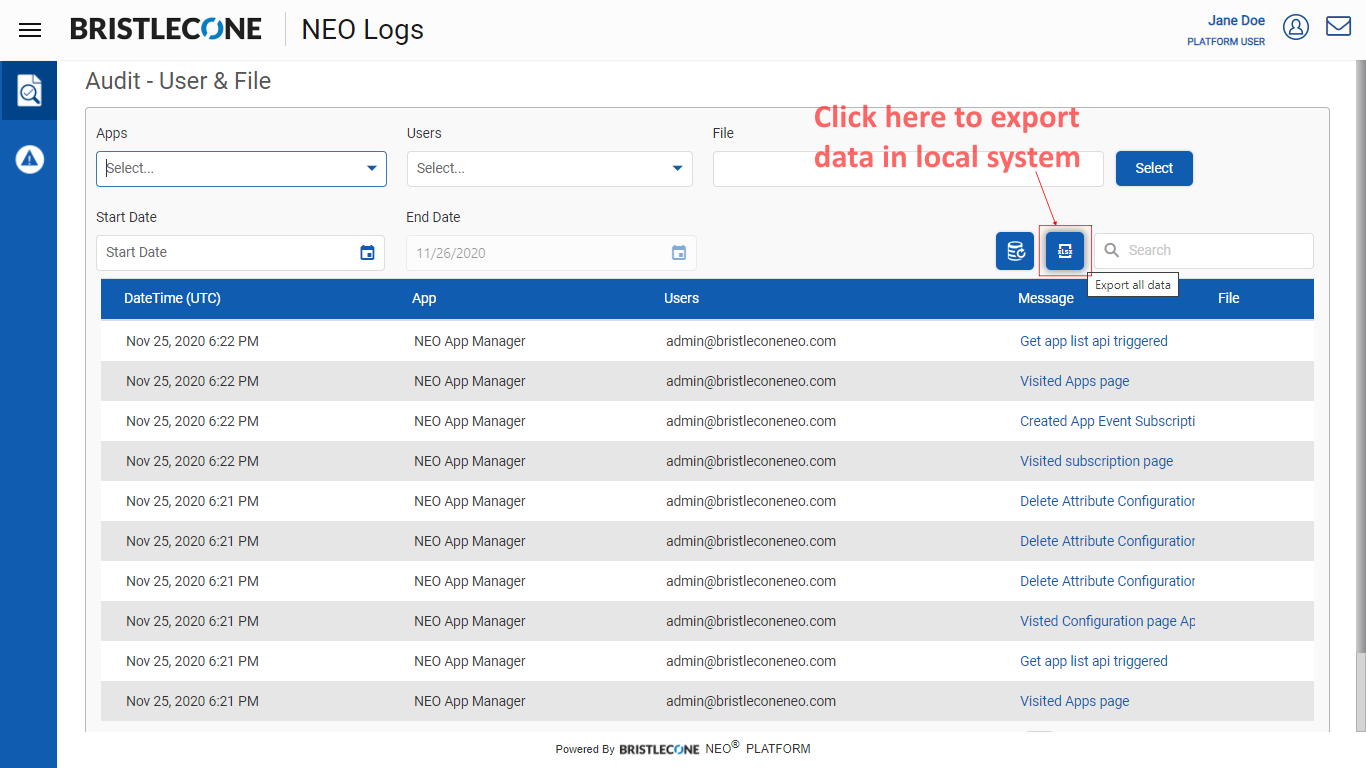 The Platform user can export all data / filtered data by clicking on the Export Data icon as shown below. The exported file will be downloaded in the local system.