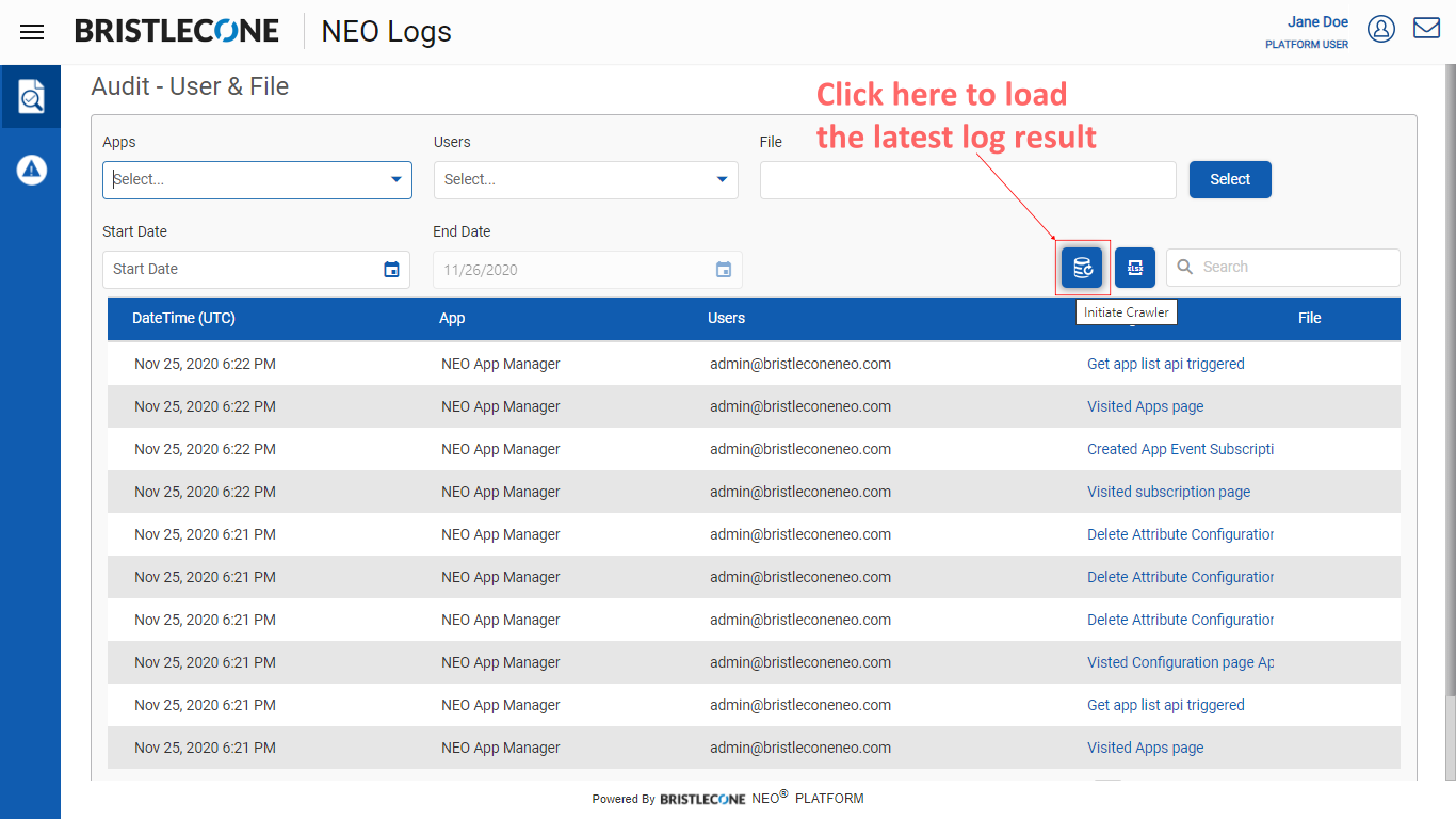 Note : To update the grid with latest log generated by any of the app, click on Initiate Crawler button anytime as shown below
